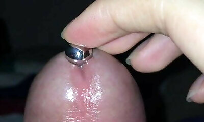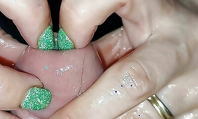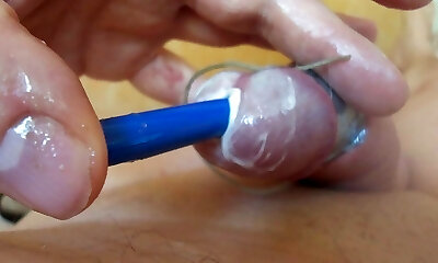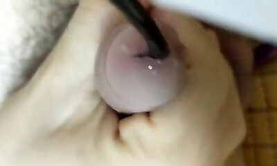 Super close-up of the dick head. Urethral games with the dilator.